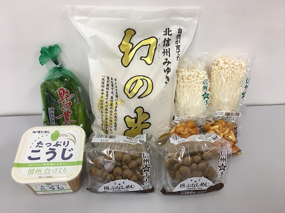 幻の米2㎏・たっぷりこうじ味噌750g・野沢菜漬1袋・きのこ3種(えのき・ぶなしめじ・なめこ 各2袋)が入った、信州の特産品が味わえる寒い時期に嬉しいセットです。
