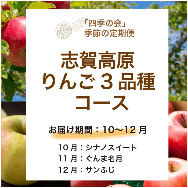 ・10月~12月にかけて全3回、志賀高原産のりんご各種をお届けします。詳しい内容は別途記載の【コース内容】をご覧ください。 ・画像はイメージです。 ・代金のお支払いは、一括前払いをお願いいたします。(予約販売となっております。) ・ご入金確認後、各農産物の発送時期になりましたら商品のお届けを開始いたします。 ・商品お届け開始後の解約・途中のお休みはできません。また、内容の変更・入れ替えは承っておりません。 ・商品のお届け先は各コースごと1ヶ所です。商品ごとにお届け先を変更することはできません。 ・天候・生育状況により発送時期が前後する場合がございます。また、収穫量が少ない場合、やむを得ず代替え品の発送となる場合もございます。 予めご了承ください。 |