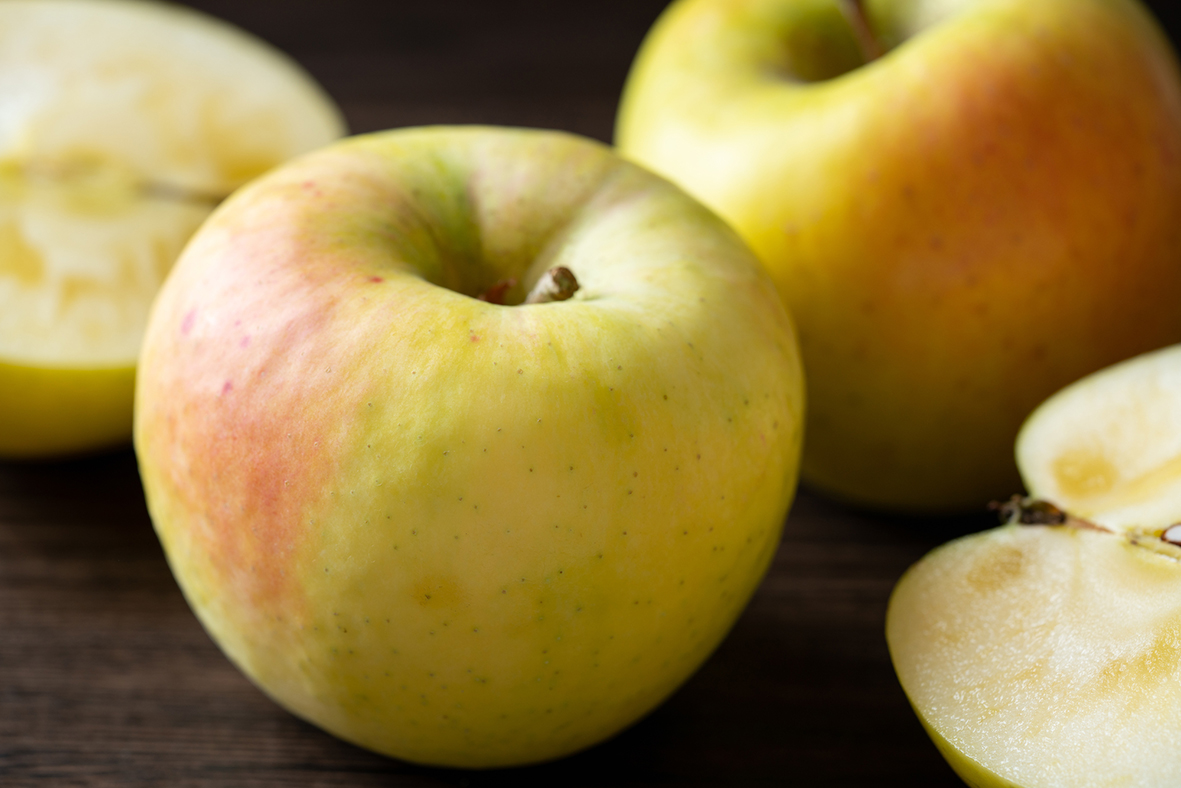 ジューシーな甘さが特徴の黄色い果皮にほんのり色づいた赤が特徴のりんごです。